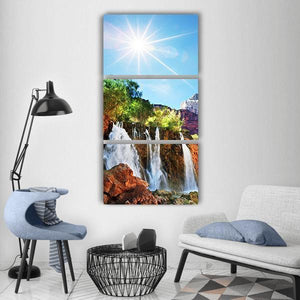A vibrant, serene depiction of a waterfall bathed in sunlight, showing multiple cascades over rocks with trees and sky in the background. Blues, greens, oranges, and white create a realistic, powerful mood with a clear sunburst effect. Suited to modern or nature-inspired rooms as a colorful landscape focal point.