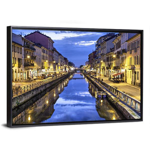 This canvas art captures the tranquil beauty of Italy's Naviglio Grande canal, showcasing reflections of buildings and streetlights on the water during twilight. The serene palette of blue, yellow, and brown adds a calming touch to any space.