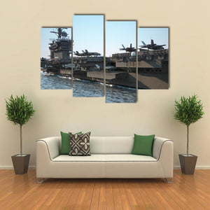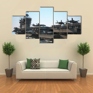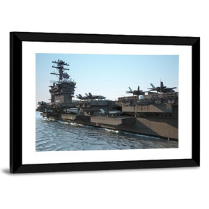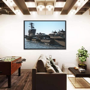 This striking canvas art piece features a powerful aircraft carrier with jets positioned on deck, set against an ocean backdrop. The artwork exudes an industrial and naval mood, ideal for adding a bold touch to any military or modern decor.