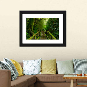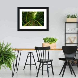 Experience the tranquility of a lush rainforest with this captivating canvas featuring a winding wooden boardwalk. Bathed in a misty atmosphere, the vibrant greens and rich browns create a serene escape that invites you into nature’s embrace.