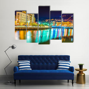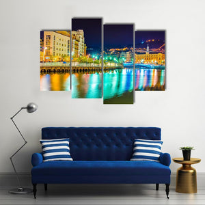 A contemporary cityscape of the Nervion River, showing town buildings, a bridge and night lights. The wide, colorful scene highlights illuminated buildings and their reflections on the water, giving a vibrant, lively urban nighttime feel. Suits modern living rooms and urban interiors as a bold room decor piece.
