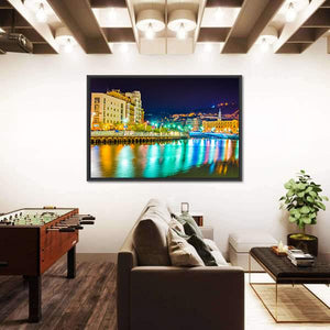 This canvas wall art captures the vibrant city skyline along the Nervion River, showcasing a lively nighttime scene. The blues and teals reflect beautifully in the water, while illuminated buildings add an energetic feel to your space.