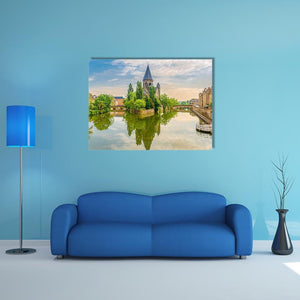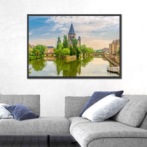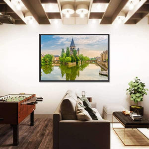 The Neuf Temple canvas captures a serene landscape of a cathedral reflecting in calm waters, surrounded by trees and buildings. Its peaceful palette of blue, green, and tan creates an idyllic atmosphere, making it a charming addition to any space.