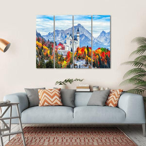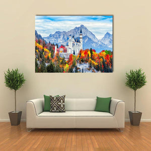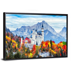 Experience the charm of Neuschwanstein Castle with this vibrant canvas print. Set among picturesque mountains and trees, it captures the beauty of autumn foliage in a palette of blues, greens, and warm colors. This artwork brings a scenic touch to your space.