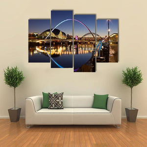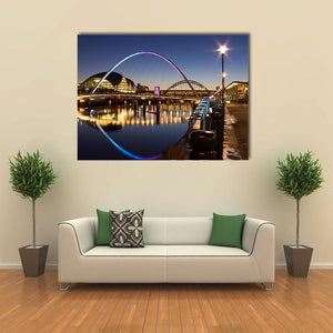 This artwork captures a vibrant nighttime cityscape of Newcastle, featuring a bridge illuminated with colorful lights and reflected beautifully in the river. The modern composition and striking palette create an urban feel that enriches any space.