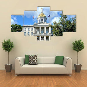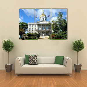 This landscape artwork features the grand New Hampshire State House, showcasing its impressive dome, columns, and the vibrant colors of flags against a bright sky. Ideal for adding a stately touch to your decor.