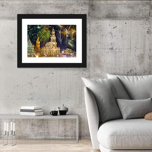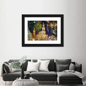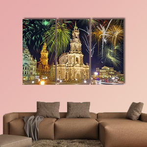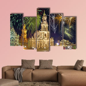 This cityscape shows Dresden’s ornate, brightly lit buildings beneath bursts of fireworks. The realistic, wide-shot night scene uses dark blue with splashes of yellow, green and white to create a festive, celebratory atmosphere that works well in modern living rooms or entryways.