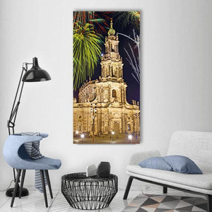 Fireworks in Dresden captures a Baroque church lit by celebratory pyrotechnics and a gilded dome, with an ornate facade and illuminated windows. The realistic, festive scene reads as grand and dramatic in gold, yellow, black, green, and red tones. It fits modern room decor such as living rooms or entryways that welcome bold cityscape art.