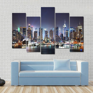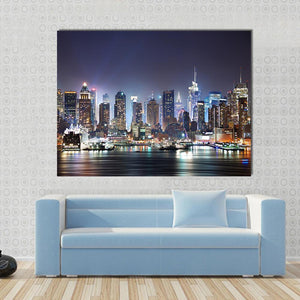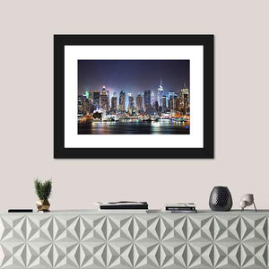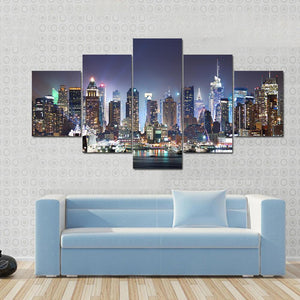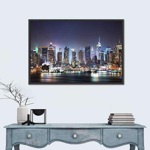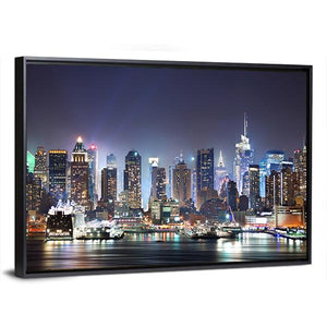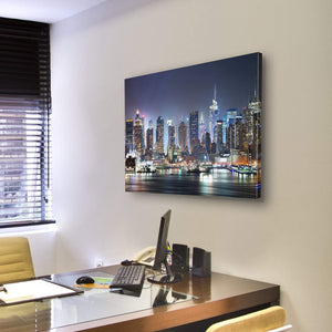 This vibrant cityscape captures the energy of New York's skyline at night. Featuring illuminated skyscrapers and reflections on the water, it brings a bold, modern touch to your wall decor.