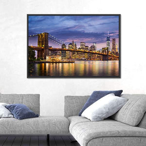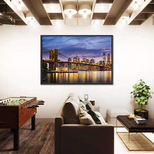 A panoramic view of the Brooklyn Bridge and Manhattan skyline at twilight, rendered in photorealistic detail. Deep blues and purples meet glowing yellows and oranges as city lights reflect on the river, creating a vibrant, energetic nighttime scene. Suits modern living rooms and offices that welcome bold city imagery.