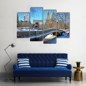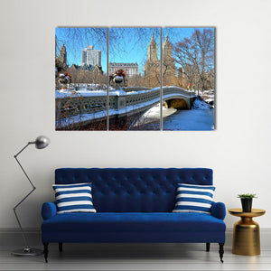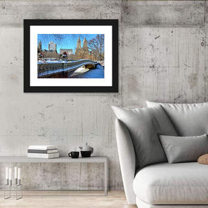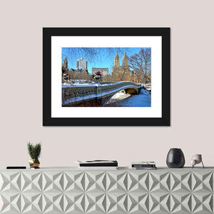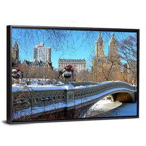 This artwork depicts a serene winter scene centered around the iconic Bow Bridge in Manhattan. The picturesque setting features delicate snow on the ornate bridge railing and a frozen body of water, evoking a sense of calm and beauty.