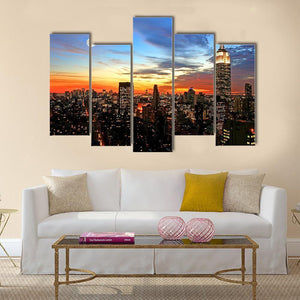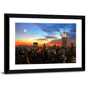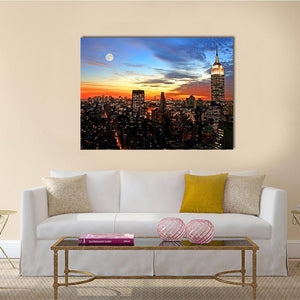 NY Midtown Skyline At Dark Canvas Wall Art shows the New York City skyline with the Empire State Building beneath a moonlit, dramatic sky. Orange and blue city lights create a vibrant, awe-inspiring urban scene that suits modern living rooms or house interiors.