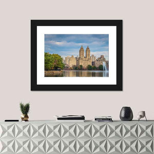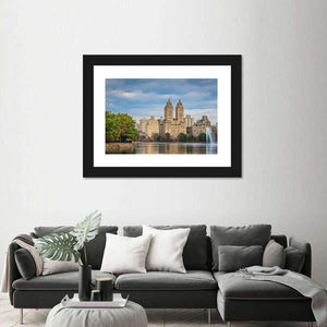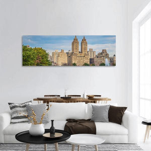A panoramic photographic view of New York’s city skyline, featuring buildings, trees and a fountain under a clear, bright daytime sky. Twin towers appear prominently; blue, tan and green tones give the scene a calm, urban feel that suits modern living rooms or workspaces.