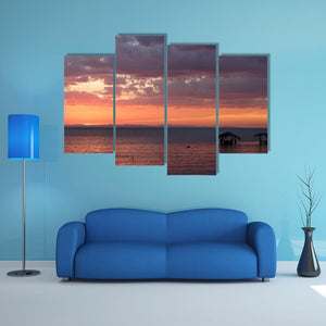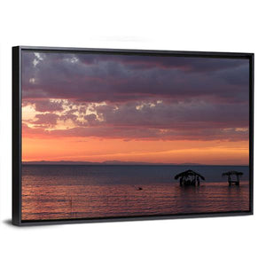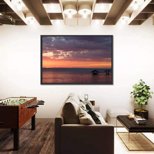 This canvas art captures the serene beauty of Nicaragua's lake at sunrise, featuring a rustic hut on stilts beneath dramatic clouds. The vibrant palette of orange, purple, and blue evokes a peaceful, natural atmosphere, perfect for any room in your home.