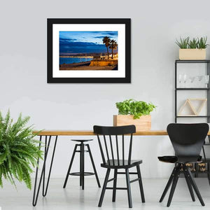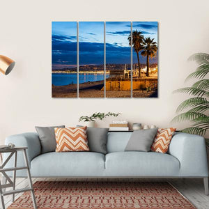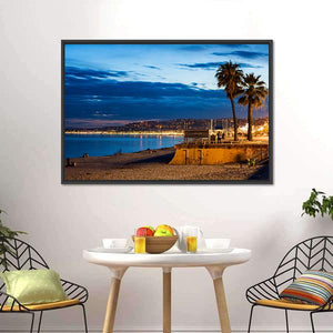 This beautiful canvas art features a serene view of the French Riviera, showcasing palm trees and city lights reflecting on the calm ocean. The tranquil twilight colors of blue, yellow, and white create a peaceful atmosphere, perfect for any room in your home.