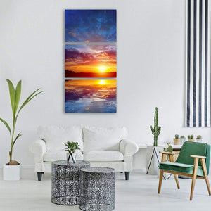 A serene sunset over a calm lake, with dramatic clouds and a mirror-like reflection that balances the scene. Warm blues, oranges and yellows give the image a tranquil, modern feel. It suits modern living rooms, bedrooms, or office walls as a calming focal point.