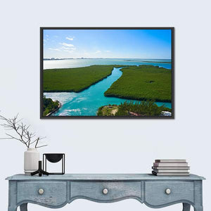 This beautiful artwork captures the serene beauty of Nichupte Lagoon, featuring a winding river that flows through lush mangrove forests and turquoise waters. With its natural palette of greens and blues, this piece brings a calming vibe to any space.