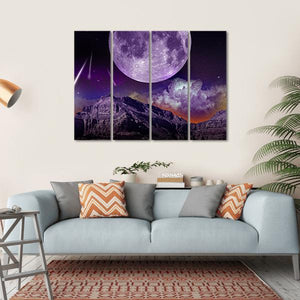 This captivating artwork features a large purple moon against a dramatic night sky filled with meteors and stormy clouds, set over a rugged mountain range. Its mysterious and awe-inspiring atmosphere makes it a striking addition to any modern decor.