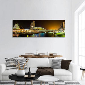 Night In Bremerhaven Panoramic Canvas captures Bremerhaven’s nighttime cityscape with buildings, a bridge, and lights reflecting on the water beneath a blue sky. The image has a vibrant, modern urban mood that fits contemporary living rooms or offices.