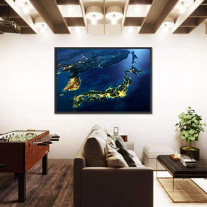 This captivating canvas artwork showcases our planet from space, highlighting the serene beauty of Earth at night. The blue hues and vibrant lights represent regions like Japan and Korea, creating an awe-inspiring visual that enriches any room's decor.