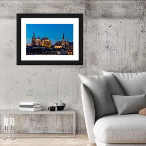A photographic cityscape of Aachen at night centers the cathedral and city skyline, with tall spires and a glowing dome set against deep blues, gold highlights and cool greys. The illuminated, historic mood suits modern living rooms, offices, or entryways that welcome architectural character.