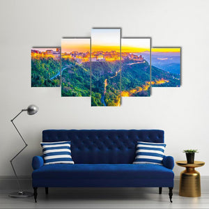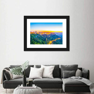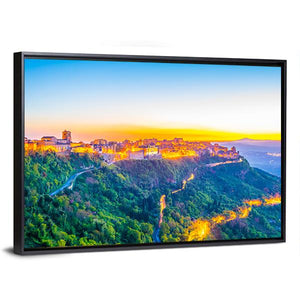 Enna Town In Sicily Canvas Wall Art depicts a hillside town with winding roads, trees, and softly illuminated buildings at twilight. Blue, green, yellow and orange tones create a serene yet vibrant evening mood. It pairs well with modern room decor — think living rooms, hallways, or offices looking for a calm, colorful focal point.