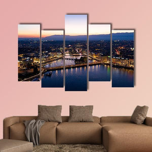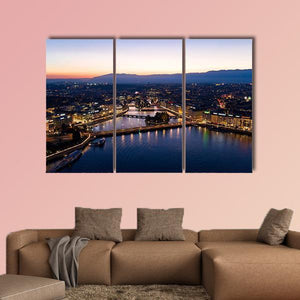 Aerial Night View Of Geneva captures Geneva's illuminated skyline and bridges from an aerial, wide vantage, with the river running through the scene. Rendered in a realistic style, the twilight sky and blue-to-orange palette create a peaceful, serene, and majestic atmosphere. Suited to modern living rooms or offices seeking calm, city-centered wall decor.