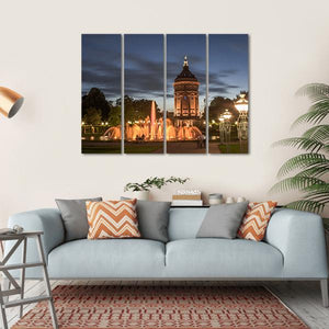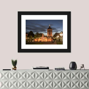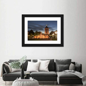 This artwork captures a serene night scene in Mannheim, featuring a beautifully illuminated water tower and fountain amidst a tranquil park. The photorealistic style brings out the magical ambiance of the city lights against a deep blue and orange sky, making it a perfect addition to any modern décor.