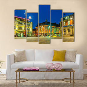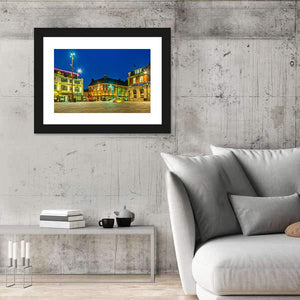 This photographic canvas captures St Nicholas Square in Leicester as a vibrant, lively town square at night, with illuminated buildings and streetlights. Cool blues with warm yellows and oranges pick out the cobblestone pavement and architectural details, a vivid cityscape that suits modern living rooms or entryways.