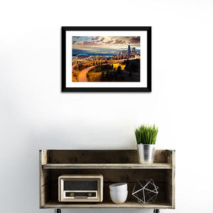 This canvas captures Seattle’s city skyline at twilight, featuring a domed stadium, a highway with streaking light trails and trees for a dynamic, energetic mood. Rendered in orange, blue, green and yellow with an aerial perspective and leading lines, the modern composition fits well in modern living rooms or urban offices.