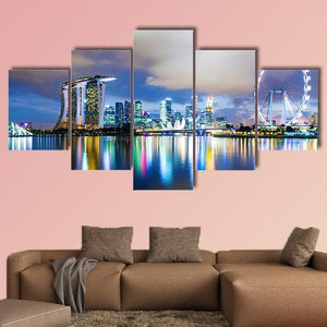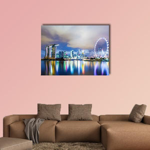 This canvas print captures the Night View of Singapore skyline with illuminated skyscrapers, a Ferris wheel and waterfront reflections. The photorealistic image uses blues, purples, whites and grays with a cloudy night sky to create a vibrant, energetic nocturnal mood that suits modern interiors and contemporary wall decor.