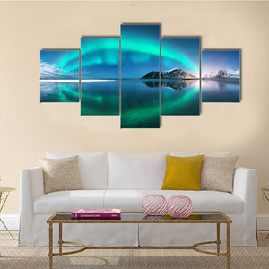 An arctic night scene that shows the aurora borealis above snow-tipped mountains with a clear mirrored reflection. Stars scatter across a blue-green sky, giving the image a serene, magical, and slightly dramatic photorealistic feel. Suited to modern interiors as nature-inspired room decor.