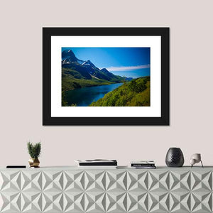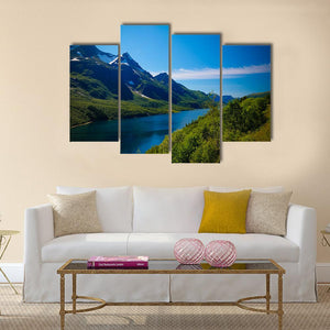 Nordfjorden and the Svartisen Glacier appear here as a calm lake framed by forested slopes and snow-capped mountains beneath a clear blue sky. The realistic landscape carries a serene, majestic mood in blue, green, white and brown tones. It works well in modern interiors or rooms that favor tranquil nature art.