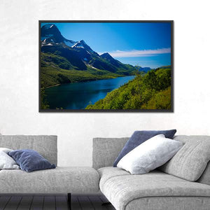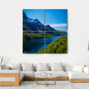 Experience the serene beauty of Norway with this captivating canvas featuring a mountain lake surrounded by snow-capped peaks and lush forests. The vibrant blue and green hues create a natural atmosphere, perfect for enhancing any room’s decor.