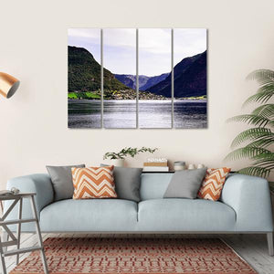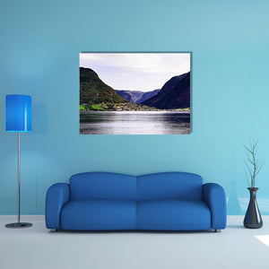 This canvas wall art captures the serene beauty of a Norwegian fjord, featuring majestic mountains and a small village nestled between lush hillsides. The calm, reflective waters create a peaceful atmosphere, making it a perfect addition to your nature-inspired decor.
