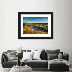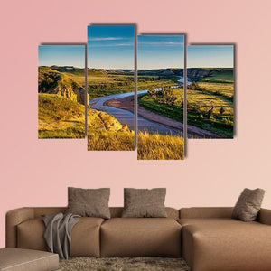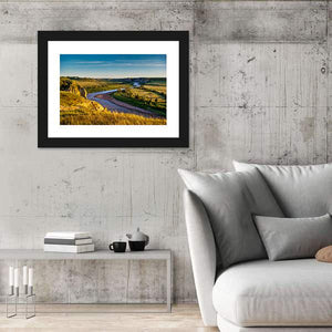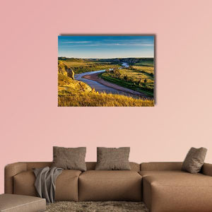 North Dakota Badlands Canvas Wall Art captures a high-angle view of a winding river through a valley and broad grasslands, with tall dry grass in the foreground and wispy clouds above. Warm golden-yellow, green, blue, and brown tones and sunlight casting long shadows create a peaceful, serene, vast mood. This realistic, scenic print works well in modern living rooms or quiet home offices.
