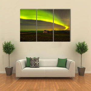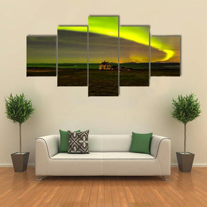 This striking canvas captures the serene beauty of the aurora borealis dancing over a field in Iceland. The vibrant greens and yellows of the lights contrast beautifully with the dark night sky and a lone house, creating a tranquil and awe-inspiring atmosphere.
