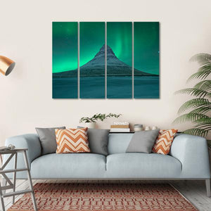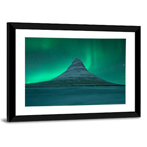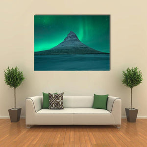This canvas features the majestic Kirkjufell mountain beneath a breathtaking aurora borealis. The serene colors of green and blue against the night sky create an awe-inspiring atmosphere that enriches any room.