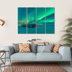 This captivating canvas features a mesmerizing aurora borealis illuminating a snowy plane wreck in Iceland. Its dramatic green and blue tones create a mysterious and serene atmosphere, inviting a sense of wonder to any space.