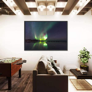Experience the serene beauty of the aurora borealis over Skagsanden Beach with this striking canvas wall art. The magical night sky reflects vibrant greens and purples on tranquil waters, creating an awe-inspiring scene that captures nature's wonder.