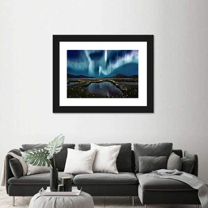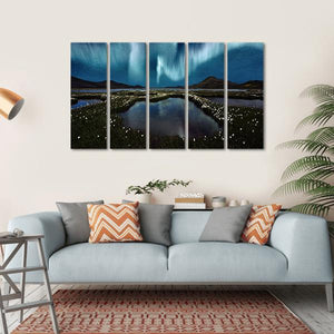 This stunning canvas wall art captures the magic of the aurora borealis as it dances over a serene tundra. The vibrant palette of blues, greens, and purples reflects beautifully in the calm waters, while stars twinkle overhead and small white flowers peek through the grass. Ideal for those seeking a piece that brings the wonder of Iceland's night sky to their decor.