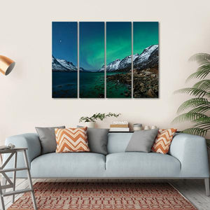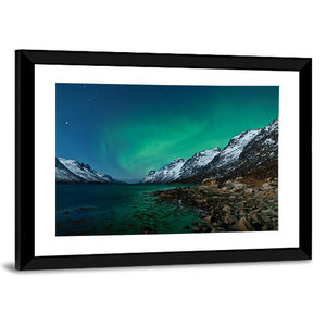 Experience the serene beauty of the aurora borealis captured over snow-capped mountains and a rocky shore. This majestic canvas wall art creates an awe-inspiring atmosphere that beautifully complements any nature-inspired decor.