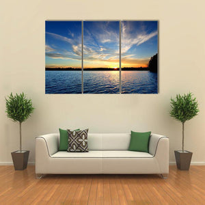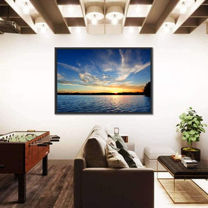 Northern Wisconsin Lake Sunset Canvas presents a calm lakeside sunset with wispy clouds and a tree silhouette at the right edge. The realistic scene in blues, warm oranges, white highlights, and deep contrast evokes a serene, peaceful mood. It suits modern or nature-inspired wall decor.