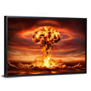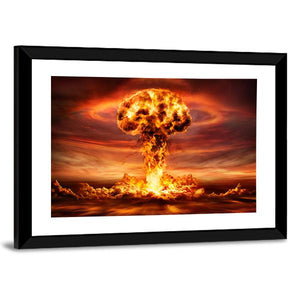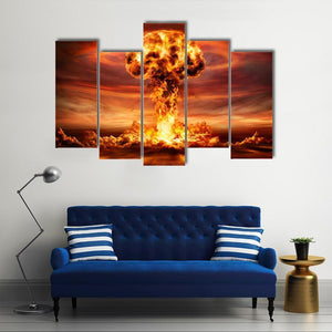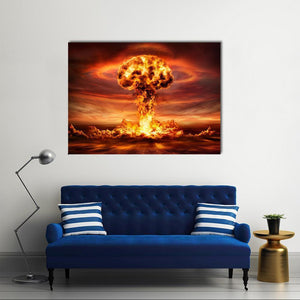 A centered, symmetrical abstract depiction of a mushroom cloud and explosion on canvas. The fiery palette of orange, red, yellow and black creates an intense, destructive mood with billowing clouds and a strong light source. Suited to modern interiors or science-themed rooms that want a bold, dramatic focal piece.