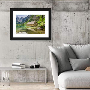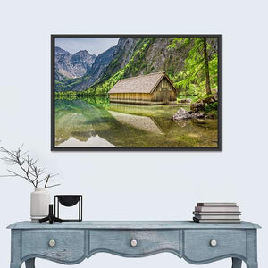 Bring a touch of Germany's serene beauty into your home with this canvas wall art featuring a tranquil lake scene. A rustic wooden boathouse nestles along the water, while majestic mountains reflect softly in the blue-green hues. This piece captures the peaceful essence of nature, perfect for enhancing your living space.