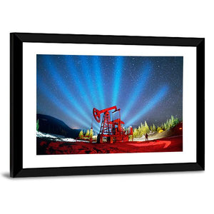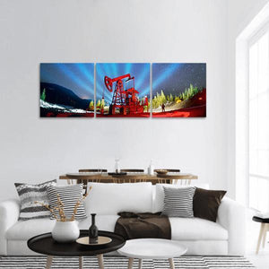 This panoramic canvas features a red oil pump jack beneath a dramatic night sky, with glowing blue aurora lights, visible stars, and a shadowy forest. The mysterious, powerful scene—lit with industrial-style dramatic lighting and a lone silhouette—suits modern or industrial interiors as striking wall decor.