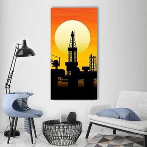 This print shows a centered oil rig silhouette against a large sun at sunset, rendered in orange, yellow, black and gray. The minimalist, graphic composition creates a stark, dramatic mood that suits modern and industrial interiors.