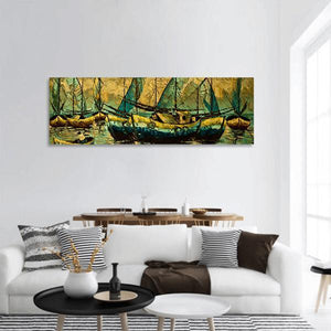 This panoramic canvas shows boats on calm water with a serene, atmospheric, impressionistic feel. Thick impasto brushstrokes and the reflected light on the water bring the yellow, blue, green and brown palette to life, making it a natural fit for modern living rooms or contemporary wall decor.