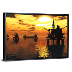 This realistic canvas art features oil rigs silhouetted against a breathtaking sunset over the ocean. The serene atmosphere combines hues of orange, yellow, and blue, creating a striking visual that highlights reflections on the water and distant ships.