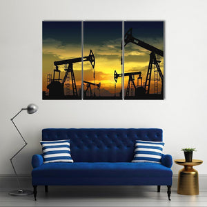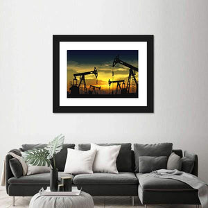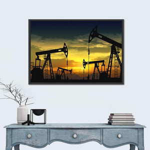 Multiple oil pump jacks are silhouetted against a yellow and orange sunset, with clouds illuminated by the setting sun. The rule-of-thirds composition and dark blue and black tones create a dramatic yet serene industrial scene that works well in modern or industrial rooms.